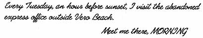 As I said, the week went slow, but on the following Tuesday, I commandeered the family canoe and headed for Vero Beach. Per Morningstar's written invitation, we would share the evening, I hoped, in her express office.