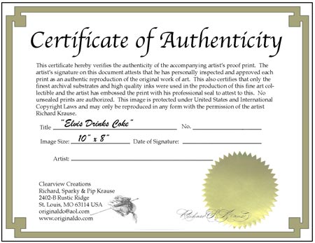 Below you see a typical Certificate of Authenticity which will be filled out after the sale and accompany each print sold. Use browser Back Button to return to the page from which you just came or click here to go to our homepage.