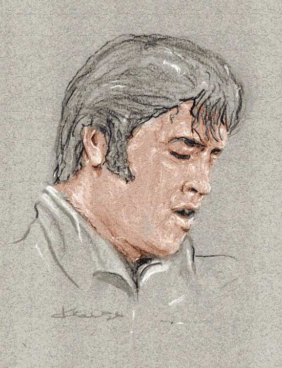 Elvis "the pelvis" Presley 8"x10" colorized pastel pencil on gray paper in double-matted 11"x14" Heartbreak Hotel frame.
