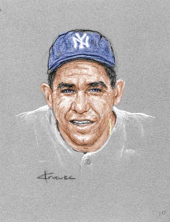 Yogi "the bear" Berra 8"x10" colorized pastel pencil on gray paper in double-matted 11"x14" Yankee frame.