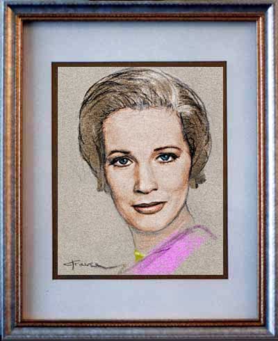 Julie "Mary Poppins" Andrews 8"x10" light and dark pencil on gray paper in double-matted 11"x14" K-Mart frame.