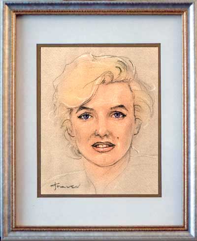 Marilyn "Blonde Bombshell" Monroe 8"x10" colorized pastel on toned paper in double-matted 11"x14" K-Mart frame.