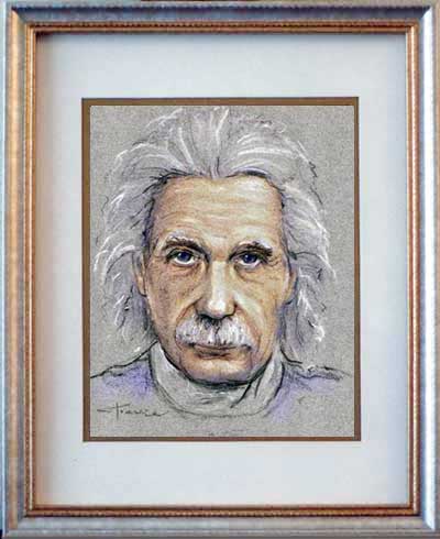 Albert "Mr. Serious Science" Einstein 8"x10" light and dark pencil on gray paper in double-matted 11"x14" K-Mart frame.