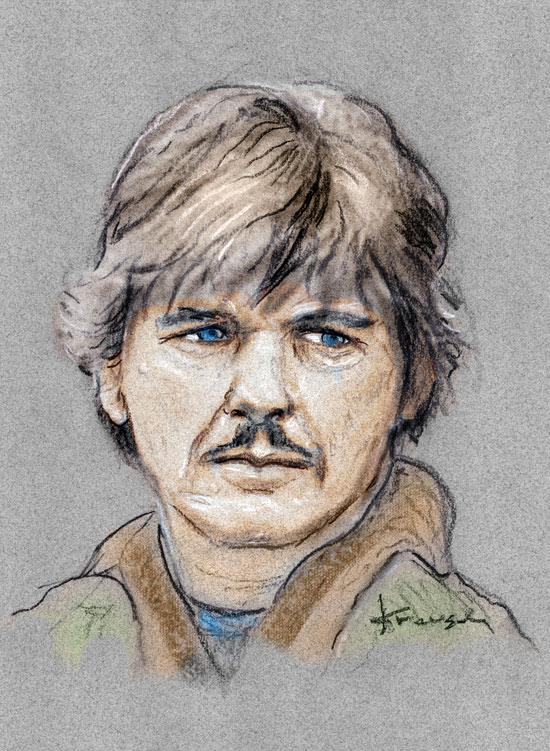Charles Bronson of Death Wish 8"x10" light and dark pencil on gray paper in double-matted 11"x14" K-Mart frame.