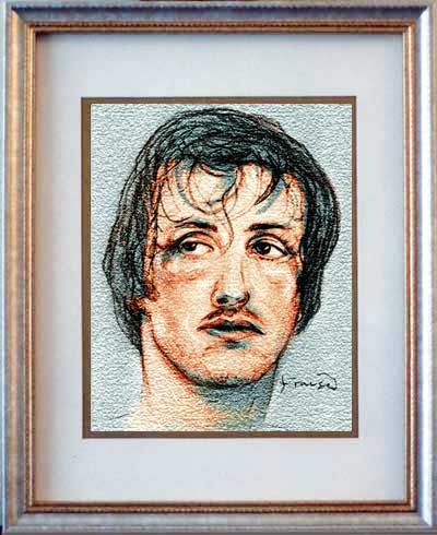 Sylvester Stallone of Rocky 8"x10" light and dark pencil on gray paper in double-matted 11"x14" K-Mart frame.