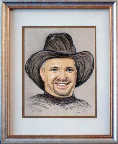 Garth Brooks of Home on the Range 8"x10" light and dark pencil on gray paper in double-matted 11"x14" K-Mart frame.