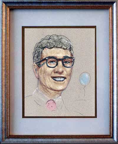Buddy "peggy sue" Holly 8"x10" light and dark pencil on gray paper in double-matted 11"x14" K-Mart frame.