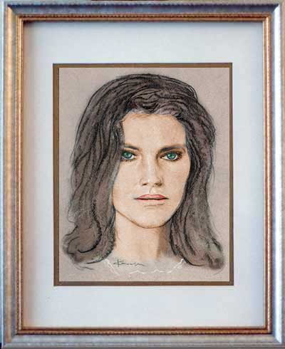 Jacqueline Bisset of Just Plain Beautiful 8"x10" light and dark pencil on gray paper in double-matted 11"x14" K-Mart frame.