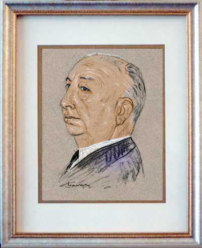 Alfred Hitchcock of Pscycho 8"x10" light and dark pencil on gray paper in double-matted 11"x14" K-Mart frame.