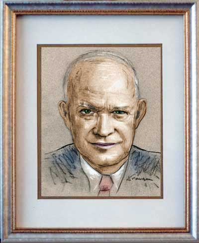Dwight Eisenhower of The 50's 8"x10" light and dark pencil on gray paper in double-matted 11"x14" K-Mart frame.