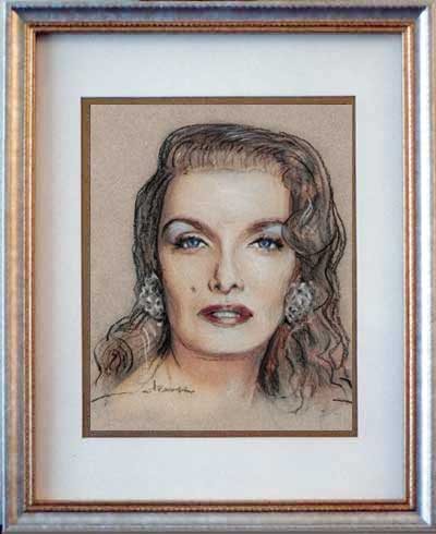 Jane "The Outlaws" Russell 8"x10" light and dark pencil on gray paper in double-matted 11"x14" K-Mart frame.