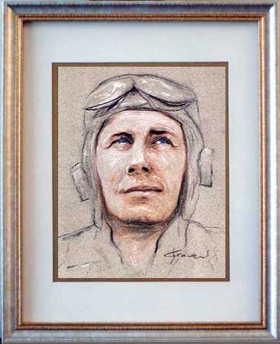 Chuck Yeager "Mr. Sound Barrier" 8"x10" colorized pastel and on gray paper in double-matted 11"x14" K-Mart frame.