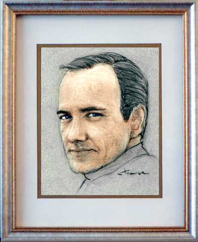 Kevin Spacey of "L. A. Confidential" 8"x10" colorized pastel and on gray paper in double-matted 11"x14" K-Mart frame.