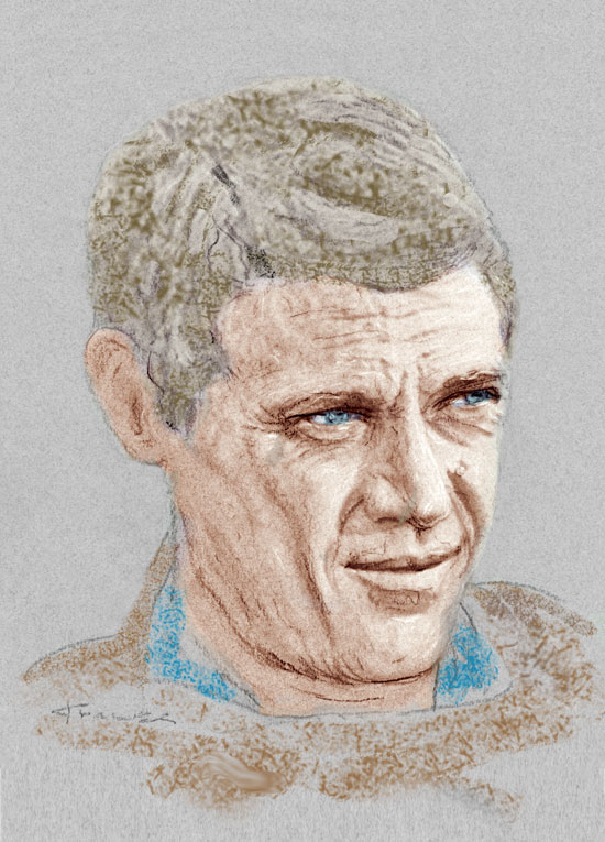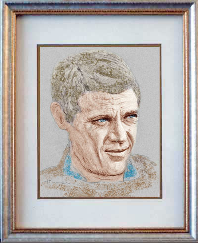 Steve McQueen of "Bullitt" 8"x10" colorized pastel on gray paper in double-matted 11"x14" budget frame.