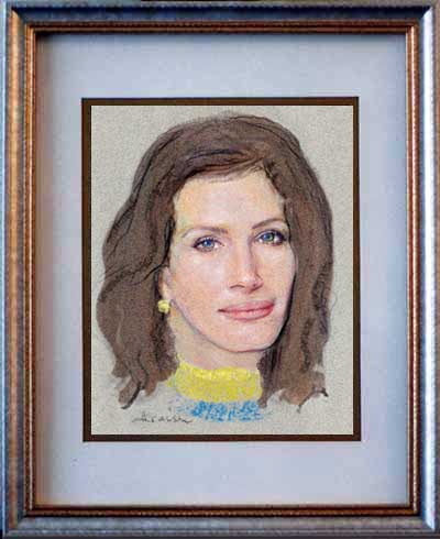 Julia "Pretty Woman" Roberts 8"x10" light and dark pencil on gray paper in double-matted 11"x14" K-Mart frame.