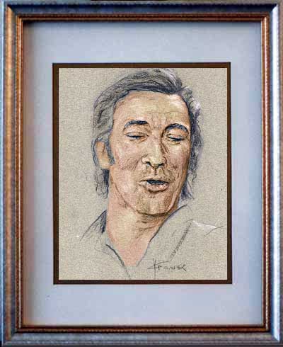 Bruce "Smalltown" Springsteen 8"x10" light and dark pencil on gray paper in double-matted 11"x14" K-Mart frame.