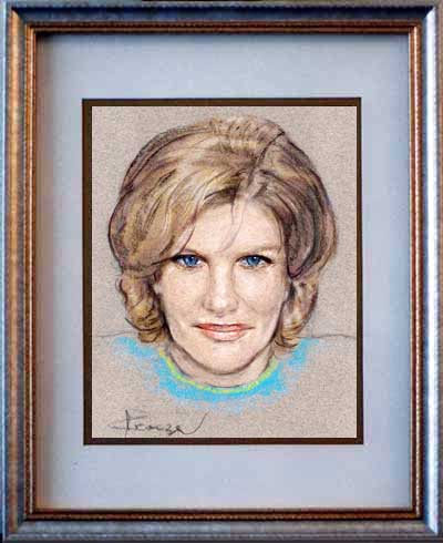 Renee "Oscar Cleavage" Russo 8"x10" light and dark pencil on gray paper in double-matted 11"x14" K-Mart frame.