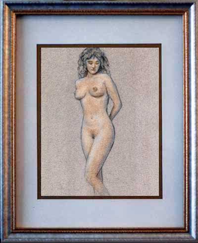 Yoko "standing" Ono 8"x10" light and dark pencil on gray paper in double-matted 11"x14" K-Mart frame.