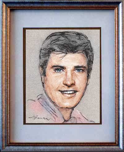 Rick "Travelin' Man" Nelson 8"x10" light and dark pencil on gray paper in double-matted 11"x14" K-Mart frame.