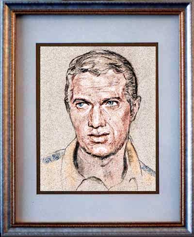 Steve "Dead or Alive" McQueen 8"x10" light and dark pencil on gray paper in double-matted 11"x14" K-Mart frame.