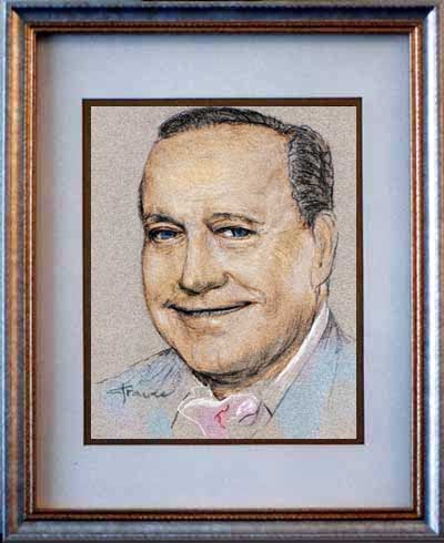 Jack "Cheapskate" Benny 8"x10" light and dark pencil on gray paper in double-matted 11"x14" K-Mart frame.