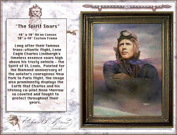 Long after their transatlantic flight, Lone Eagle Charles Lindbergh's timeless essence soars high above his trusty vehicle - the Spirit of St. Louis. Painted for the Diamond Anniversary of the aviator's courageous New York to Paris flight, the image also prominently displays the Earth that Chuck and his lifelong co-pilot Anne Morrow so coveted and fought to protect throughout their years. |