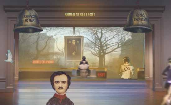 And below is a relatively spooky area of our repository looking out on our portrait of Edgar Allan Poe, "The Raven Within."
