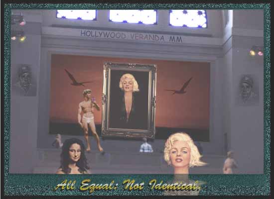 Below is a placement scrapshot of the mezzanine catwalk as we strolled across the elongated atrium at Originaldo's Place. We arrived just in time to see David again, this time offering a flower to our painting of "A Candle In The Wind." | ![]() |