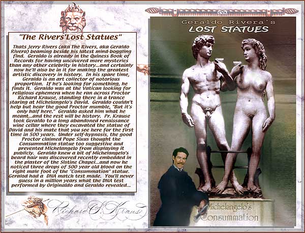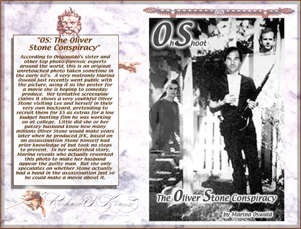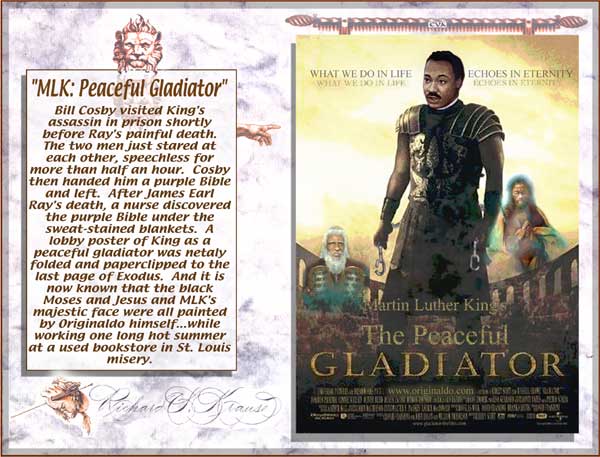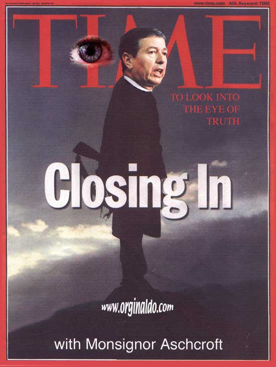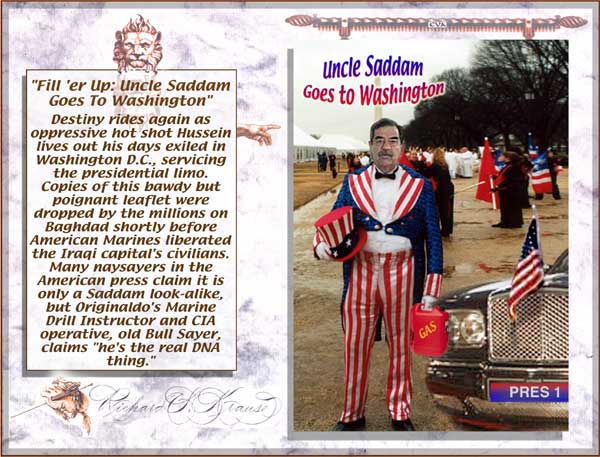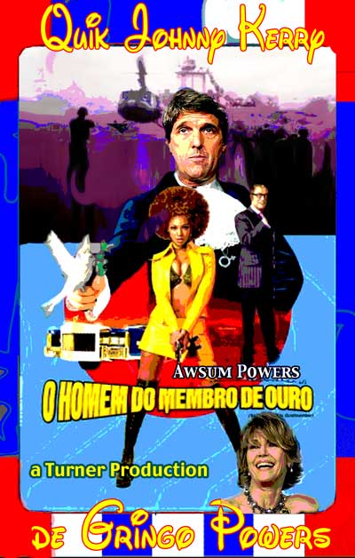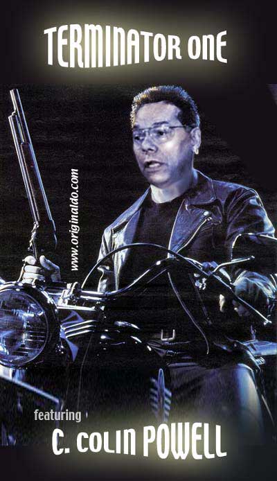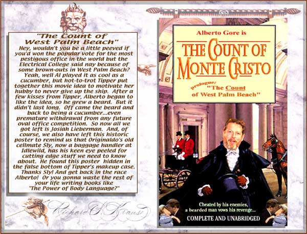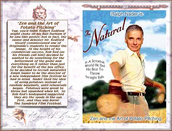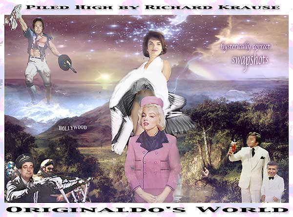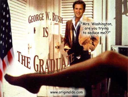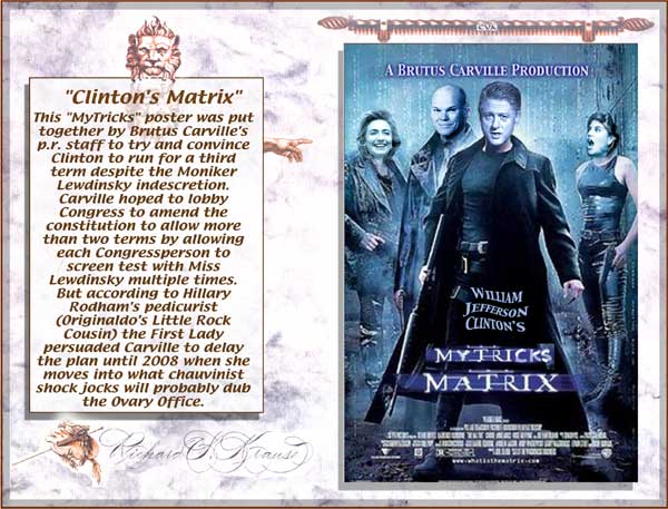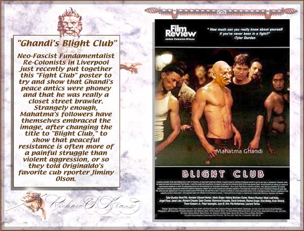 "George Bush's Heads of State" "Mahatma Ghandi's Fight Club" "Bill Clinton's Matrix" "Bing Crosby in Bing Goes Bang Bang" This totally authorized poster was put together by Originaldo's son Waldo who has served very discretely for some years as the Bush dynasty's key private advisor. The awesomely shocking image is a slightly retouched photo taken aboard Air Force One showing the heads of state that will birng liberation to Iraq. A bust of a smiling George washington was sculpted by Waldo especially for the photo op. One of Barbara Bush's literacy students designed the "No-Nukes" logo. The glowing image of Lady Liberty outside the Oval Window was rendered by Kate Smith's niece. Neo-Fascist Fundamentalist Re-Colonists in Liverpool just recently put together this "Fight Club" poster to try and show that Ghandi's peace antics were phoney and that he was really a closet street brawler. Strangely enough, Mahatma's followers have themselves embraced the image, after changing the title to "Blight Club," to show that peaceful resistance is often more of a painful struggle than violent aggression, or so they told Originaldo's favorite cub reporter Jiminy Olson. This "MyTricks" poster was put together by Brutus Carville's p.r. staff to try and convince Clinton to run for a third term despite the Moniker Lewdinsky indescretion. Carville hoped to lobby Congress to amend the constitution to allow more than two terms by allowing each Congressperson to screen test with Miss Lewdinsky multiple times. But according to Hillary Rodham's pedicurist (Originaldo's Little Rock Cousin) the First Lady persuaded Carville to delay the plan until 2008 when she wins what misoynist shock jocks will certainly dub The Ovary Office. This totally unauthorized poster was put together by Ursula Andress's butler who happened to be Originaldo's illegitimate Uncle Raz. Ursula had a passionate crush on Bing Crosby and tried to persuad Ian Fleming to use his clout and replace Sean Connery with Bing. Ursula is said to never have made love without one of Bing's records spinning next to her. Needless to say, Sean deservedly remained the one and only 007 but he did agree to have White Christmas played every time he and Ursula embraced, both off and on screen. .