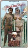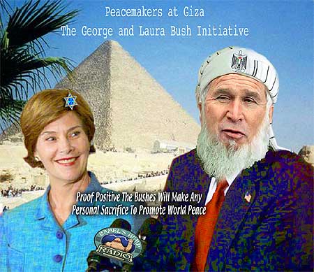 "Piddler at the Podium" So where in Allah's name does the saga of this terroristic opium den poster begin? At birth, of course...when the frustrated doctor who delivered little Yassir slapped Yasser's mother in the face instead of Yasser's prune-shaped butt. Mrs. Arafat took one look at her little baby's face and said, "Oh, I see why you slapped me, Dr. Plo." And as impressionable Arafat grew up all his playmates in the sand teased him about how he had been hit by Allah's ugly stick." So "Y" as his family nicknamed him, decided at Sandstone University to go into show business and prove to his family how pretty he really was. But SU had no dramatics department so Yasser temporarily changed his name to Yassel and visited Israel's prestigous King David School of Drama and tried out for Fiddler on the Roof. He never even came close to getting the part, but the failed audition was all the evidence he needed to blame the Jews for his people's woes, and he pimped his little sister to pay a hungry Jewish artist to make up this phoney poster to show his friends back home. To tell the truth, the poster isn't all that phoney, because as soon as he got home, Y began fiddling in his very own rooftop shit house where nobody could see him, building bombs to blow up school buses headed for grade schools in the King David School District. "Ya gotta kill them little kikes in kindergarten, before they're big enough to keep you from driving them all into the sea," Y always said to his psychopathic followers. "To make an awful long and drawn out story short, "Ain't fate funny again," Originaldo says, "from Fiddler on the Roof to Piddler at the Podium and finally Shitler in the Sand."