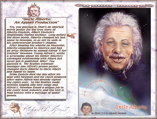 After blowing the whistle on Mussolini, Alberto emigrated to America and had an artsy firstborn he named Alfred "E for Einstein" Newman. Young Alfred E. wrote a screenplay about his father Alberto's estranged relationship with Albert but never got it published. Why? You guessed it. The Beatles eventual manager saw Alfred's promo poster, changed Uncle Alberto to Uncle Albert and Appall to Apple. Brian Epstein died the day after his deal with Newman and his check bounced after naive Alfred had already signed the rights over, So the Beatles made millions singing silly love songs and Alfred E. Newman found a unigue job in the comic book industry..and the rest is Mad history with a message of quasi-genuis. |