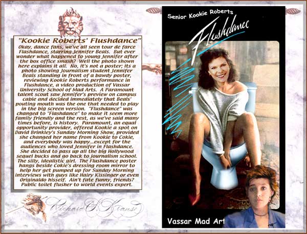 "Kookie Robert's Flushdance" Okay, dance fans, we've all seen tour de farce Flashdance, starring Jennifer Beals. But ever wonder what happened to young Jennifer after the box office smash? Well the photo shown here explains it all. No, it's not a poster; its a photo showing Journalism student Jennifer Beals standing in front of a bawdy poster, reviewing Kookie Roberts performance in Flushdance, a video production of Vassar University School of Mad Arts. A Paramount talent scout saw Jennifer's preview on campus cable and decided immediately that Beals' pouting mouth was the one that needed to play in the big screen version. "Flushdance" was changed to "Flashdance" to make it seem more family friendly and the rest, as we've said many times before, is history. Paramount, an equal opportunity provider, offered Kookie a spot on David Brinkley's Sunday Morning Show, provided she changed her name from Kookie to Cokie, and everybody was happy...except for the audiences who loved Jennifer in Flashdance. She decided to pass up all the big Hollywood sequel bucks and go back to journalism school. The silly, idealistic girl. The Flushdance poster hangs beside Cokie's dressing room mirror to help her get pumped up for Sunday Morning interviews with guys like Hairy Kissinger or even Originaldo hisself. Ain't fate funny, friends? Public toilet flusher to world events expert. "James Dean: Old Fart at the Wheel or Rubble Without a Cause?" The obvious question from looking at this old book cover? "Was James Dean really only 24 when he died?" We'll never know for sure. Because only the cover of this book has surfaced so far. It was discovered nailed to the wall of a junk yard in Southern California last year by Originaldo himself when his old LeBaron blew its radiator after crossing the desert headed for Hollywood.