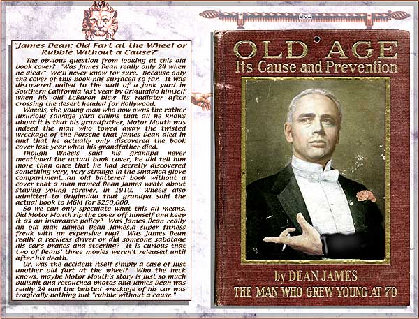 Though Wheels said his grandpa never mentioned the actual book cover, he did tell him more than once that he had secretly discovered something very, very strange in the smashed glove compartment...an old battered book without a cover that a man named Dean James wrote about staying young forever, in 1910. Wheels also admitted to Originaldo that grandpa sold the actual book to MGM for $250,000.
